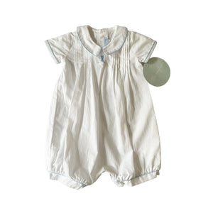 - This handsome romper features a delicately embroidered rabbit with cotton tail on chest along with pleated detailing.
